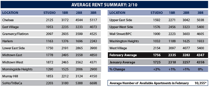 Average rents for one- and two-bedrooms each increased 1 percent in February of 2010 from the previous month, the report found, with one-bedroom rents rising to $2,335 from $2,318 and three-bedroom rents increasing to $3,283 from $3,257. The average rent for a one-bedroom fell 3 percent to $2,405 from February of 2009, and two-bedroom rents fell 6 percent year-on-year from $3,483.